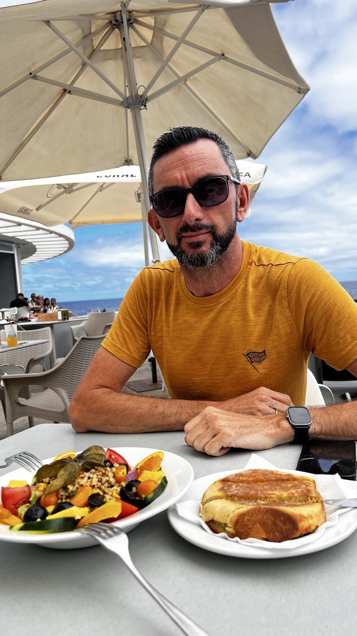 Wir essen im Restaurant vom Bad einen Salat und teilen uns auch ein Bolo do Caco, ein traditionelles portugiesisches Brot gefüllt mit Knoblauchbutter.